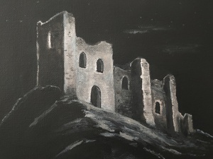 2025Vervallen burcht geschilderd op zwarte ondergrond.